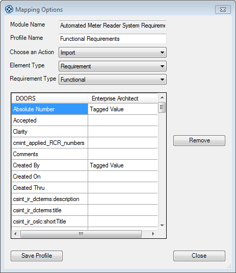 As part of this process you can create an import profile to define what the import should operate on. An import profile is a template in which you specify the DOORS object properties to be imported into mapped Enterprise Architect element properties.