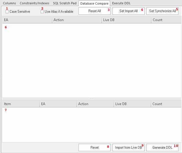 The Database Compare functionality requires the Database Builder to have a valid connection to a live database. This database connection is shared by the 'SQL Scratch Pad', 'Database Compare' and 'Execute DDL' tabs of the Database Builder.