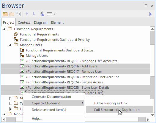 It is quite common to have a number of Enterprise Architect Repositories in an organization and it is very easy to copy and reuse Requirements (or any other elements) from one model in another. This can be achieved by simply copying a selection of Requirements or an entire Package from one repository to another, or even from one project to another in the same repository. Enterprise Architect works in the same way as any other Windows program, simply copying the selection to the clipboard and then allowing it to be pasted in another location in the same model or in another open repository.