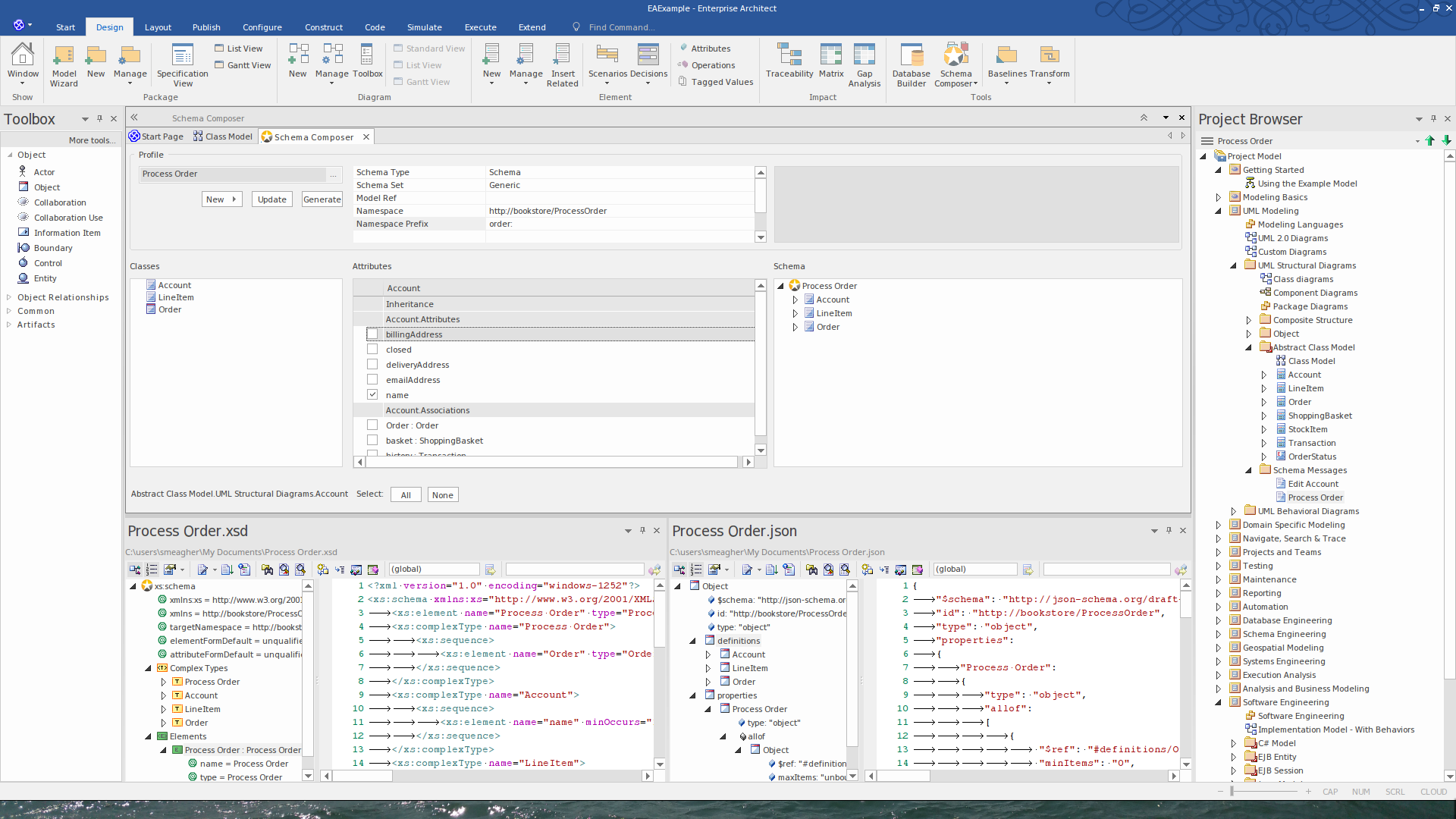 The Schema Composer is a versatile tool for quickly and easily defining a variety of formal schema from a model. Due to the unique nature of the Schema Composer, it is not necessary to use a profile or stereotyped elements when building the definition of an XSD (or other) document. This greatly enhances the re-usability of the underlying model and helps alleviate the complexity that arises when dealing directly with XSD or other element types and restrictions.