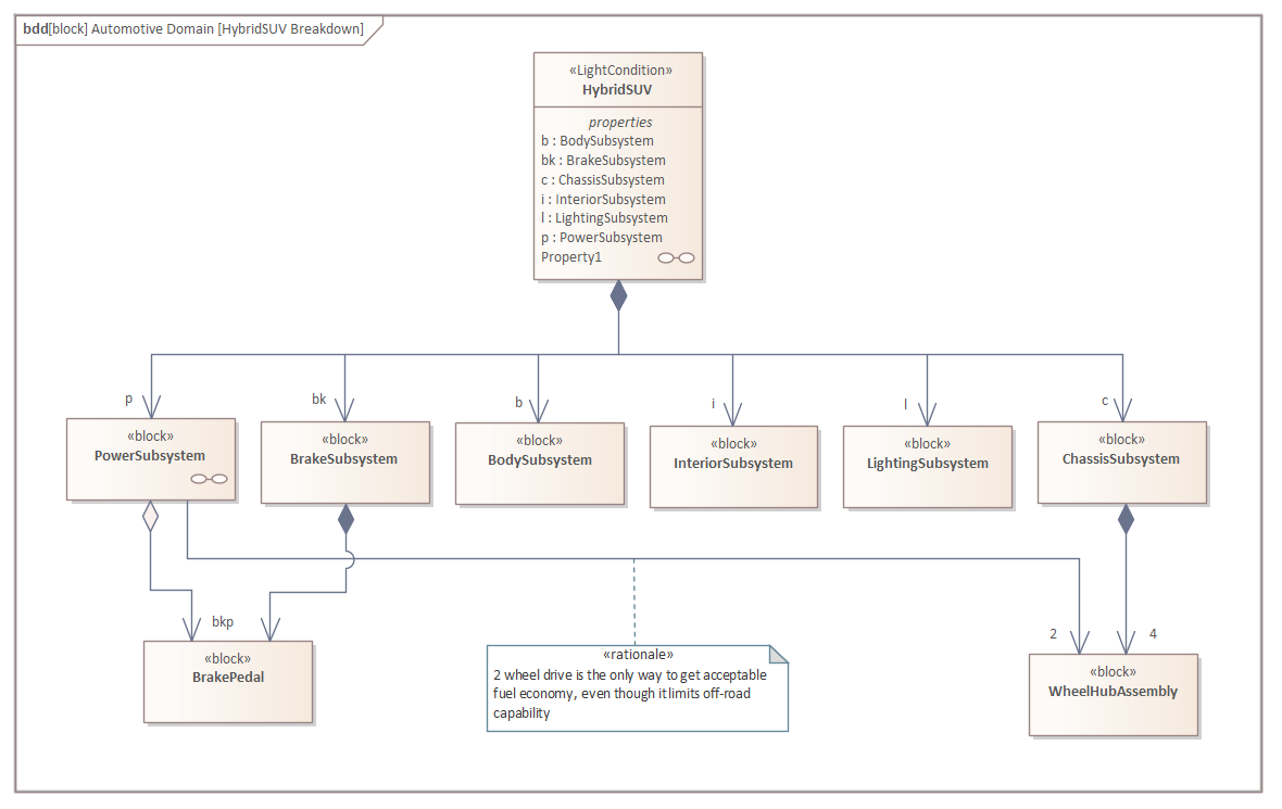 The SysML has similar grammatical categories found in natural languages, with elements that describe structure and other elements that describe behavior. The SysML describes structural things (nouns) using a Block. When engineers create diagrams, they will often use a mixture of behavior or structure elements, describing a particular aspect of a system - bringing to light some aspect of the modeled system.
