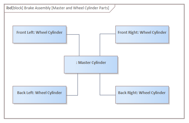 Blocks are classifiers and describe the characteristics of a set of elements that represent how the Block is used in a context. When the Block has attributes (value properties) defined, these are given specific values in the Block instances. Effectively, each Block instance has an identity and typically would have different values assigned that define the Block's state. Enterprise Architect allows these values to be specified using a Set Run State option available from the context menu. Block instances are properties or parts. Thus an engineer working in an automotive domain could define aspects of a vehicle's braking system showing blocks representing a master cylinder's relationship to a wheel cylinder defining a multiplicity of 3..4. The engineer would place instances of these blocks on Internal Block diagrams to express how the parts work together to carry out the behavioral contracts of the system.