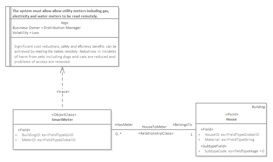 ArcGIS diagram showing a trace between a Smart Meter and a formal system requirement.