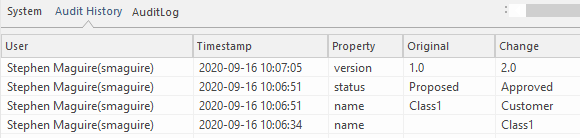 As you select different elements or connectors, the 'Audit History' tab automatically updates to reflect your current selection. For each change made to the element or connector, the tab shows: