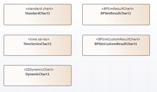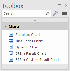 The 'Charts' Toolbox page provides a variety of Chart artifacts to simplify the creation of Charts within your model. Each type of Chart artifact is described in the Types of Chart Artifact table.