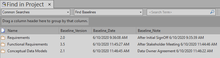 You can locate the Baselines for a model by selecting a Package in the Browser and then opening the Manage Baselines window. In the event that you have forgotten or are unsure of the location of one or more Baselines you can use the Model Search utility to locate all Packages that have Baselines. The window conveniently displays the name of the Package and the Baseline Version, Date and Notes. From this window you can locate the Package in the Browser window and then launch the Manage Baselines window.