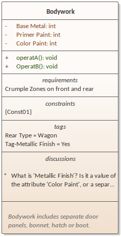 When you place an element on a diagram, you can display it with a number of compartments that reveal not only the attributes and operations of the element, but also several other properties such as tags, requirements, constraints, allocated resources, discussions and reviews.