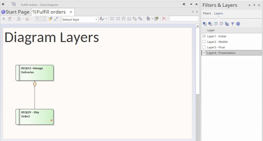 If you now clear the layer checkbox, the elements assigned to it are hidden on the diagram. If you select the checkbox, those elements are shown again.