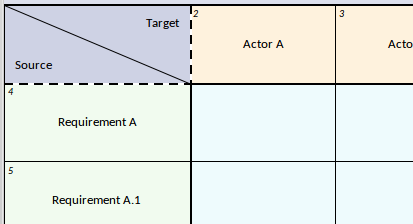 Each row and each column of the Relation Matrix view represents a diagram element. There is small italic number on the top-left corner of each row and column cell, which is the row/column index. The cell at the intersection of a row and a column shows the details of any relationships between the corresponding diagram elements.