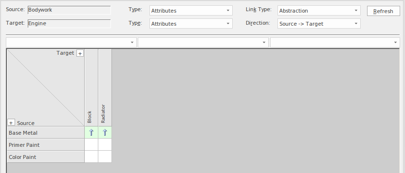 The 'Link Type' field indicates what kind of relationship is shown in the Matrix. To select the type of relationship to show, click on the drop-down arrow and click on the type. You can display relationships of all types (with the default <All> option) or a specific type - in the illustration, this is 'Abstraction'. |