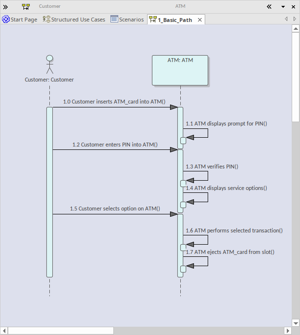 - Because the diagram generator acts on element names in the step, you must not use the element names as normal text; for example, in step 1 in the example dialog, the term ATM-Card is interpreted as a reference to the ATM element, and two 'Customer inserts ATM-Card into ATM' messages are generated for the step (to avoid confusion, in the diagram the first Message has been deleted)