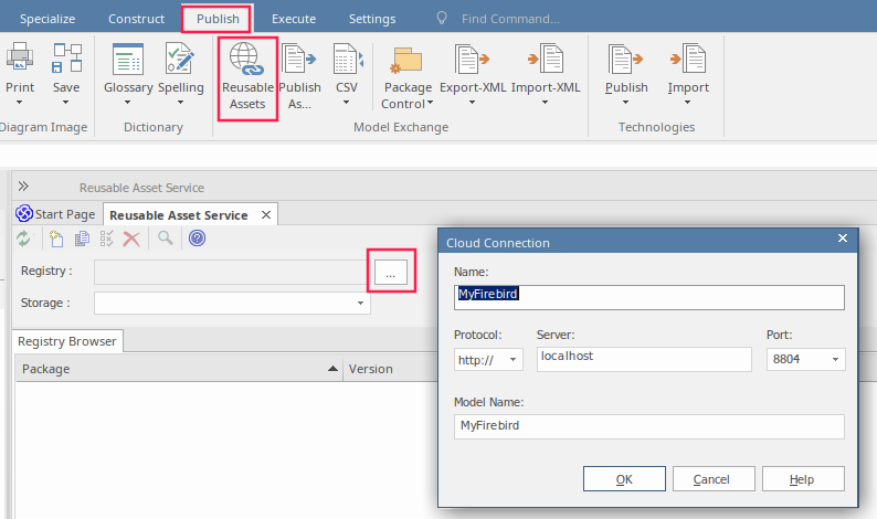 In the Reusable Asset Service view, click on the The 'Cloud Connection' dialog displays. In the Cloud Connection dialog, type in the connection details of the PCS repository: