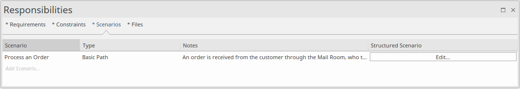 You use this tab to create a Basic Path scenario or, if a Basic Path already exists, an Alternate Path scenario. The tab also simply lists the existing scenarios on an element, and provides options to edit or delete any of these scenarios.