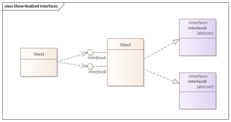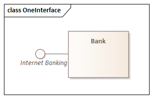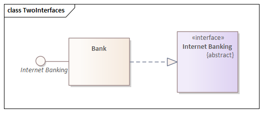 The Bank Class realizes (or provides) the Internet Banking Interface. The diagram would be a useful depiction of this simple relationship if you wanted to populate the elements with visible features and properties. However, in more complex diagrams with more detailed realized (and dependent) interfaces, you might not want to show all the information defining each element. Therefore you can represent the realized interface as the 'lollipop' node, and remove the original Interface element from the diagram (but not from the model).