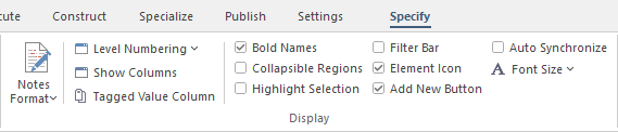 The 'Display' panel provides a range of options that make it possible to tailor the appearance of the Specification Manager view, to better display the information you want to examine. There are options providing visual cues, such as highlighting the selected element and using bold fonts to emphasize element names, as well as options to filter the list of elements that are displayed.