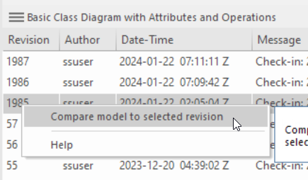 Additionally, it enables users to compare the model content against any selected revision from version control.