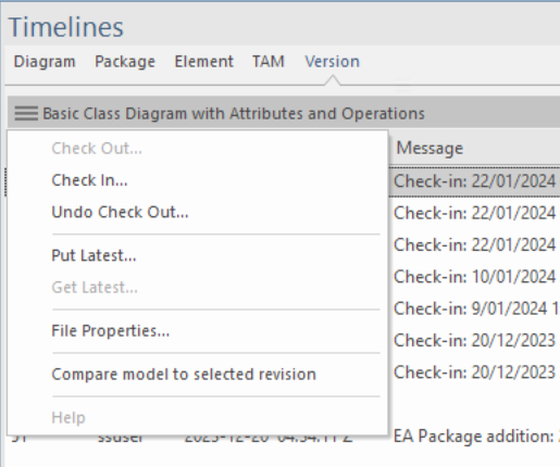 These commands operate on the version controlled package that contains the selected package, diagram or element. Where the selected package is itself version controlled, the operations will act on that package.