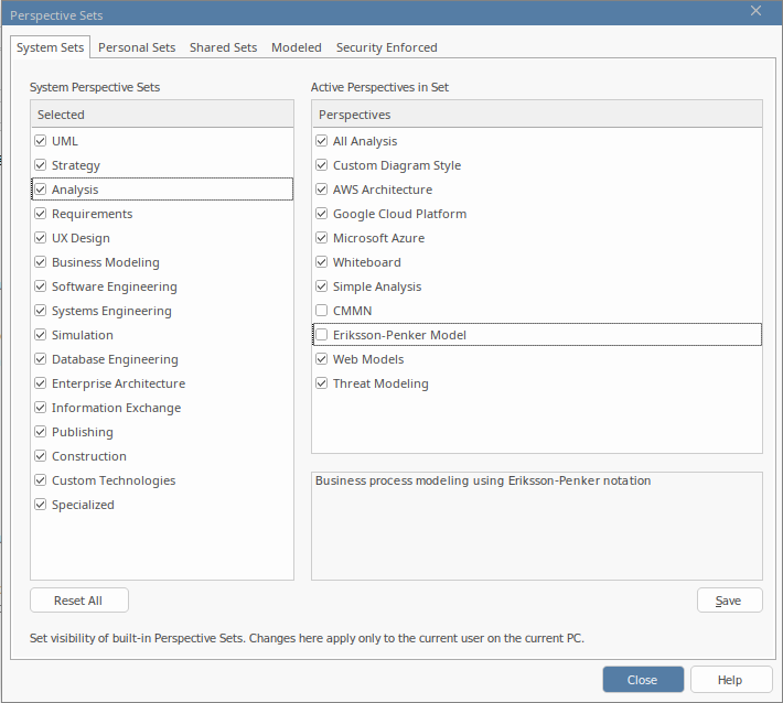 Otherwise, if you want to just exclude individual Perspectives click on the parent Perspective Set name and, in the 'Perspectives' panel, deselect the checkbox against the Perspective name. In this illustration, the CMMN and Erikson-Penker Model Perspectives have been excluded from display.