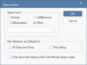 Certain properties can be graphically depicted on the Action. When you first drag the 'Action' icon from the Toolbox onto a diagram, the system prompts you to select from a list of the more common types of Action to create. If you select the 'Other' option on this list, the 'New Action' dialog displays; the 'Other' drop-down list on this dialog enables you to select a more specialized type of Action from a complete list of Action types.