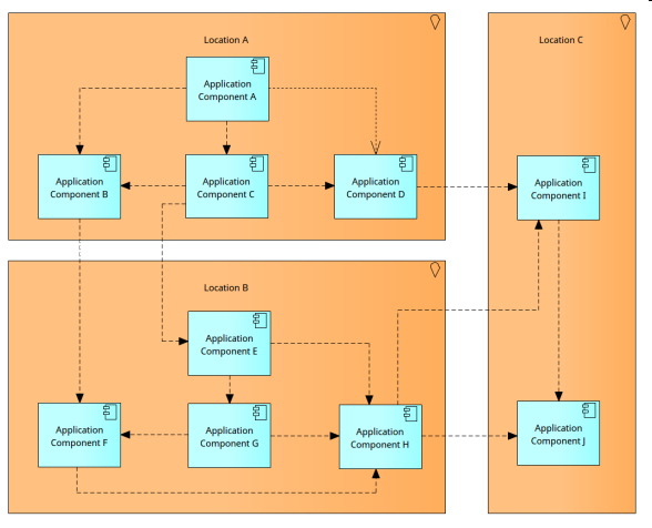 The Application Cooperation Viewpoint pattern creates elements a diagram that describe the relationships between applications components  and their locations, the services they provide or utilize and the information that flows between them.