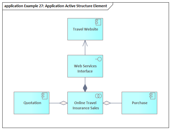 This diagram demonstrates the use of Application Components, Application Interfaces and Application Collaborations The Online Travel Insurance Sales Collaboration is aggregated of a Quotation and Purchase system modeled as Application Components. The Collaboration is composed of a Web Service Interface which in turn Serves the Travel Website.