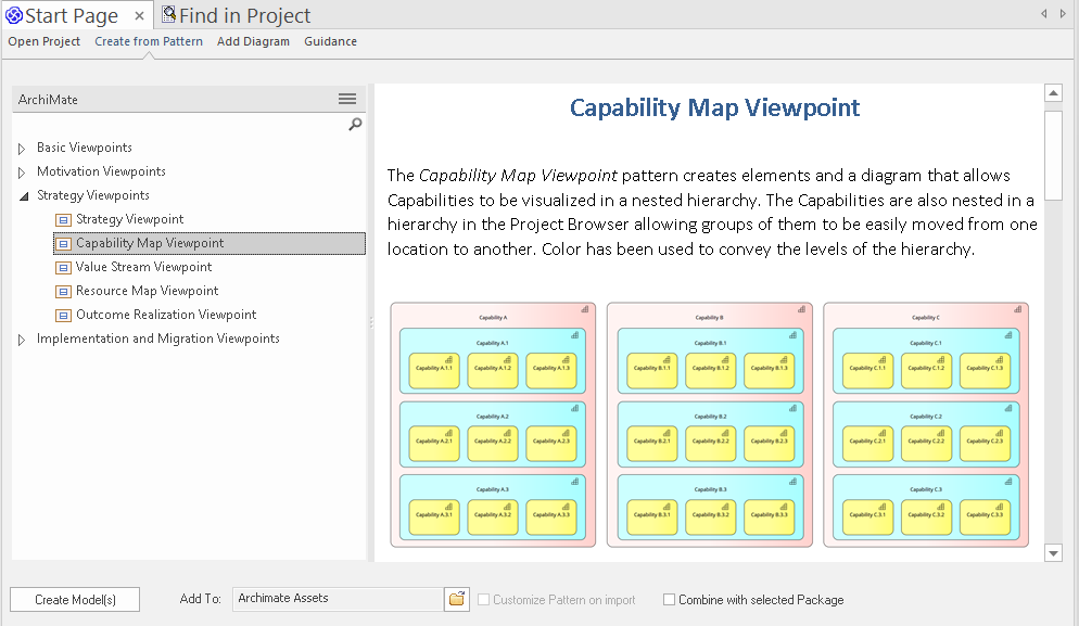 The pattern documentation provides a detailed description of the pattern (in this case a viewpoint) and an example diagram that shows the user what will be generated, including the model content and details of how to use the pattern. This illustration shows the documentation for one of the most important Strategy Viewpoints - the Capability Map viewpoint, which allows Business Architects to create a structured overview of the capabilities of the enterprise.
