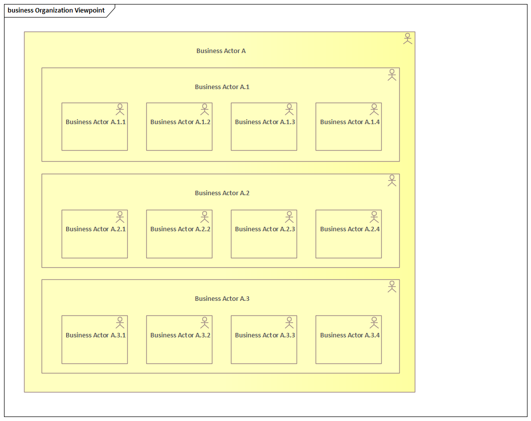 The organization viewpoint focuses on the (internal) organization of a company, department, network of companies, or other organizational entity. It is possible to present models in this viewpoint as nested Block diagrams, but also in a more traditional way, such as organizational charts. The organization viewpoint is very useful in identifying competencies, authority and responsibilities in an organization.