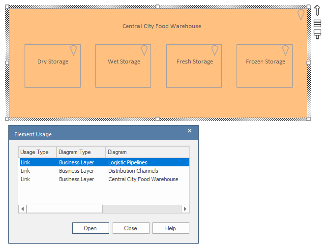 In the next diagram we see two Toolbox pages that are applicable for the Application Usage Viewpoint. The first page contains a subset of the Application Layer elements used for the Viewpoint and the second page contains a subset of the Business Layer elements.