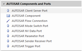 The AUTOSAR Components and Ports Toolbox page contains the elements required to model AUTOSAR components with Ports and interconnections. You can use the elements' Tagged Values to set the Port direction and whether the Port is a service Port.