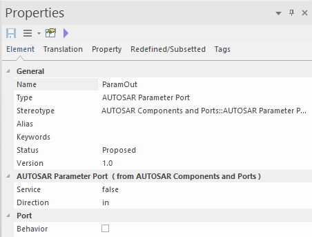 To add interfaces to Components, select from the various AUTOSAR Port elements available in the 'AUTOSAR Components and Ports' Toolbox page. Set the element name and property type in the Properties window for the Port. Use the element's Tagged Values to set the direction and whether the Port is a Service Port.