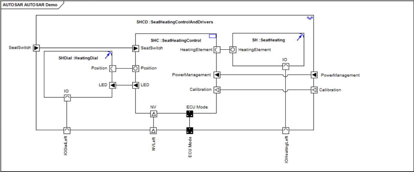 This illustration is of an AUTOSAR diagram with Components, Interfaces and Interface Connections (the Architectural View). The option 'Show Element Stereotypes' is disabled for the diagram.