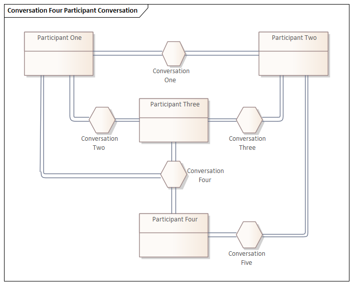 You can visualize a high level representation of groups of messages (conversations) transmitted  between two or more participants in a domain using a Conversation diagram. The goal is to present a summary of the messages that flow between a group of participants in a domain. You group sets of messages into conversations thus hiding the complexity of the choreography of the underlying messages. The conversations (hexagonal elements) are connected to the participants that engage in the conversation. This creates an overview of how the participants interact together. Just as in human speech it is possible simply to say that two (or more) parties engaged in a conversation about a topic without going into the detail of what was said.