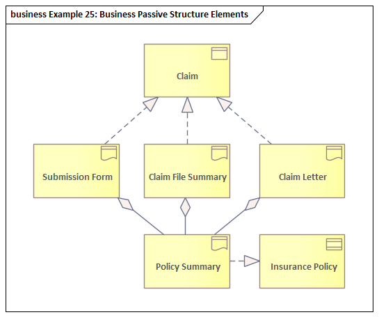 This diagram is concerned with the Business Passive Structure elements. It shows how an Insurance Claim can be Realized by a number of different representations. An Insurance Policy modeled using a Contract element is Realized by a Policy Summary, which is a Representation. All of the representations include this element, as indicated by the use of the Aggregation relationship.