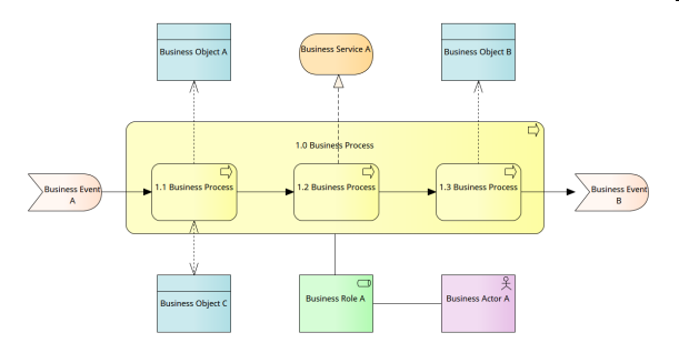 The Business Process Cooperation Viewpoint pattern creates elements and a diagram that describe the business processes showing how they relate to each other and also with their environment.  This includes relationships with Business Services and Business Objects and the Roles and Actors that perform the processes or who are affected by them.