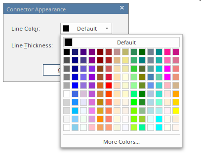 Enterprise Architect allows the appearance of connectors in diagrams to be altered to suit the intended audience. When creating a profile and a customized connector it is also possible to set its default appearance so when it is added to any diagram it will take on that appearance. For example you might want to use a different set of colors that has meaning in your architecture practice. This illustration shows the mechanism for setting the default color, font and other presentation options.