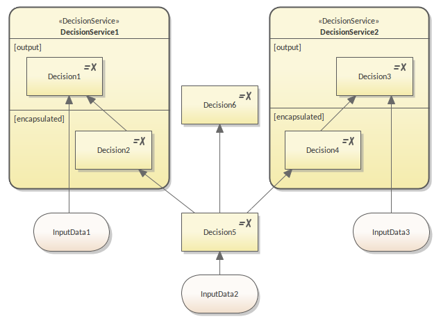 It is good practice to create a separate diagram for each Decision Service. In this way, the diagram will only contain the interface elements and encapsulated decisions for the Decision Service; the elements that are not relevant will not appear on the diagram.
