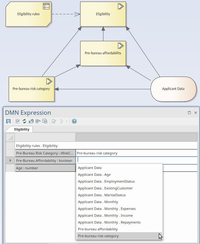 In this example, Decision 'Eligibility' requires two decisions - 'Pre-bureau risk category' and 'Pre-bureau affordability' - and one Input Data item 'Applicant data'.