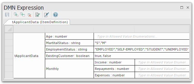 In this example, ItemDefinition 'Applicant data . Employment Status' defines an enumeration of allowed values.