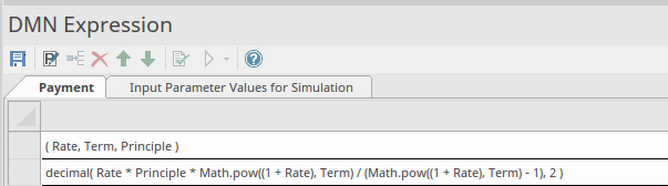 • Any expressions in a Boxed Context can use built-in functions that are defined in the customizable Template — DMN Library; for example, functions PMT(...) and decimal(...) are used in this example