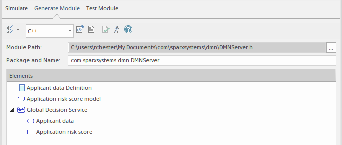 After a Decision model is created and simulated, you can generate a DMN module in Java, JavaScript, C++ or C#. That DMN module can be used with the Enterprise Architect BPSim Execution Engine, Executable StateMachine, or your own project.