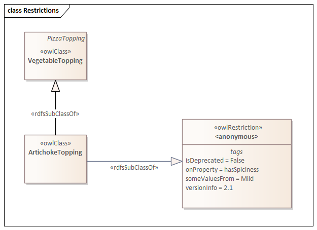 An OWL restriction is used to define a restricted set similar to an SQL Where clause. It defines a rule using the onProperty tag, and a Value Constraint such as allValuesFrom or someValuesFrom. The Restriction element is typically used in conjunction with one of the other OWL relationships relations, such as subClassOf. For example, continuing the theme of pizza toppings, for the Artichoke Topping Class: