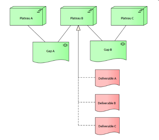 The Implementation and Migration Viewpoint pattern creates elements and a diagram that model relate programs and projects to the parts of the architecture that they implement. This view allows modeling of the scope of programs, projects, project activities in terms of the plateaus that are realized or the individual architecture elements that are affected.