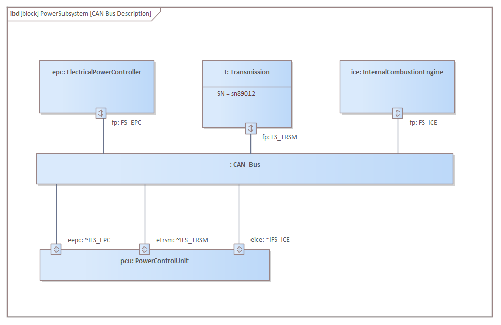 The elements in the IBD are enclosed in a frame representing the parent Block element. The name of the parent Block is displayed in both the diagram title and in the frame label; in the example diagram, the Block is called 'PowerSubsystem' and its IBD is called 'CAN Bus Description'.