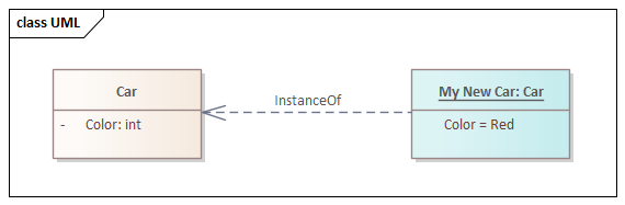 In a UML Class diagram, a modeler would represent this notion as a Class Car with an Attribute Color. An Instance (Object) of this class could be assigned the value Red for the Color attribute.