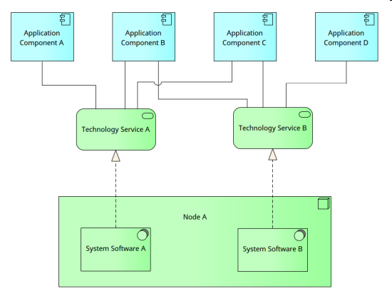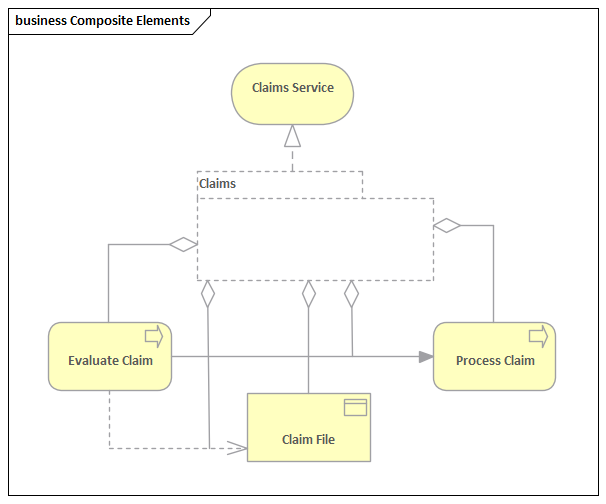 In this diagram we see elements from a number of different layers, using a number of different relationships, including nesting as an alternative. Some of the elements are presented using their rectangular style and others (e.g. Application Services) are presented using their icon style. The style can be toggled in Enterprise Architect to suit the audience and stakeholders.