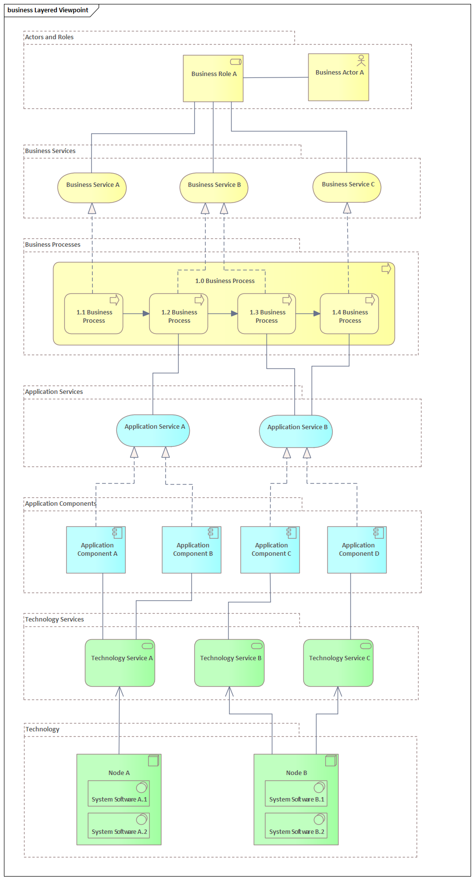 The Layered Viewpoint pattern creates a number of elements and diagrams that allow the visualization of multiple layers of an Enterprise Architecture in a single diagram. The partitioning which uses the Grouping element allows the representation of elements such as Business Processes in dedicated layers and elements such as Application Services in services layers. Any number of layers can be included but the diagram is most expressive when dedicated and service layers are interleaved.