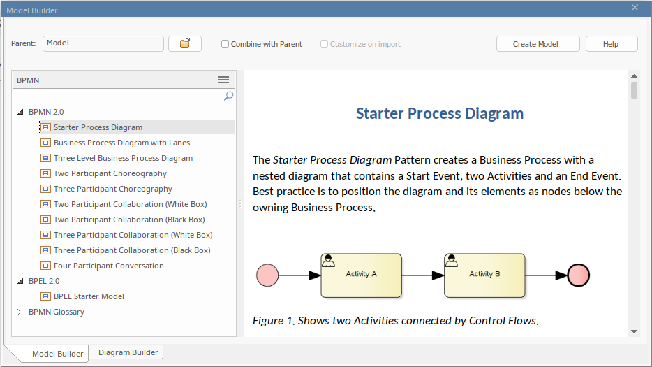You can also use some of the built-in patterns available for BPMN from the Model Builder dialog to create a diagram of any type. Spend some time reading the description of the pattern to understand the diagram and objects that will be inserted as part of the pattern.