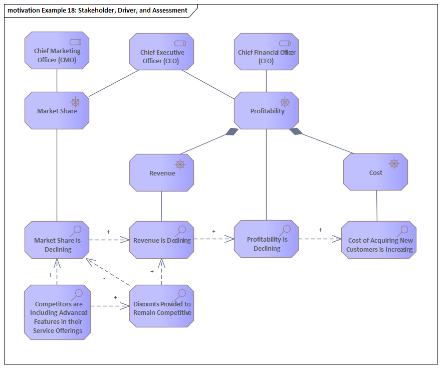 This diagram is concerned with Drivers and the Stakeholders that are concerned about them, which in this example are at the executive level. We see that the Driver entitle Profitability has been decomposed into two other drivers namely: Revenue and Costs. Assessments have been associated with the Drivers which paint a clear picture of the state of the organization. Influence relationship (which can be drawn between any two motivation elements) show how the assessments are related to each other. The (+) indicating a positive influence and (-) indicating a negative influence. This is example 18 in the Motivation Chapter of the specification.
