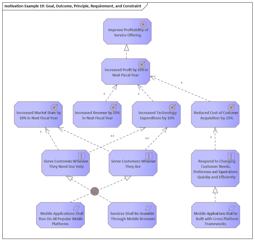 This diagram is concerned with the relationship between Goals, Principles, Requirements, and Constraints. The goal “Improve Profitability of Service Offering” is realized by the outcome “Increased Profit by 10% in Next Fiscal Year” and “Reduced Cost of Customer Acquisition by 25%”. We see the use of the influence relationship between outcomes with the indicator of (+) or (-) effect. The outcomes are in turn influenced by a number of principles and the principles are realized by a number of requirements. We also see the use of the OR Junction in the bottom left of the diagram.