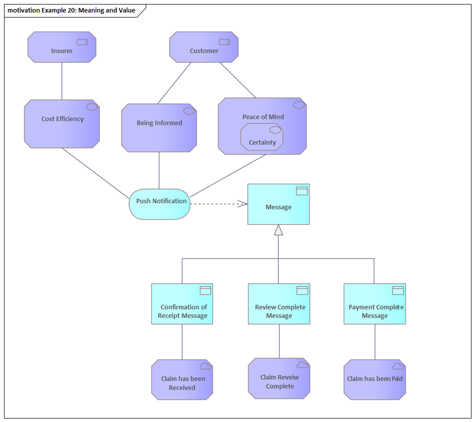 Using Enterprise Architect a modeler can create any number of diagrams using the ArchiMate diagrams and Toolbox palettes. The motivation elements can be connected together to create expressive narratives that describe an Enterprise Architecture and the motivation for making business or technology changes articulated in other parts of the architecture. These diagrams have been taken from the Open Group's ArchiMate Specification.